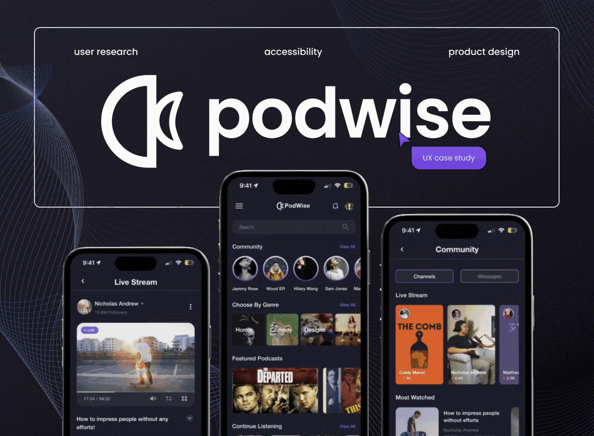 Podwise is a podcast application concept designed to deliver an intuitive and accessible listening experience. The project explores UI/UX design, audio-content interaction and community features for podcast listeners and creators.