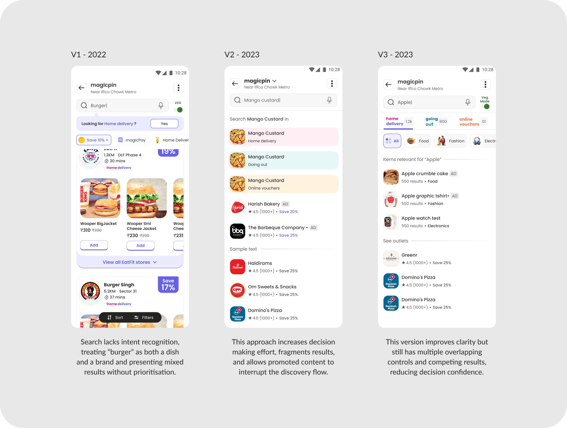 Magicpin is a multi-service ecosystem that serves a diverse set of user needs across food delivery, dining, vouchers, and shopping. Search is a critical entry point, but the existing experience was optimized for known-item queries rather than intent-driven discovery. This case study explores how we redesigned Magicpin’s search experience to prioritize user intent over raw queries, reduce cognitive load, and improve business outcomes through measurable, experiment-driven decisions.